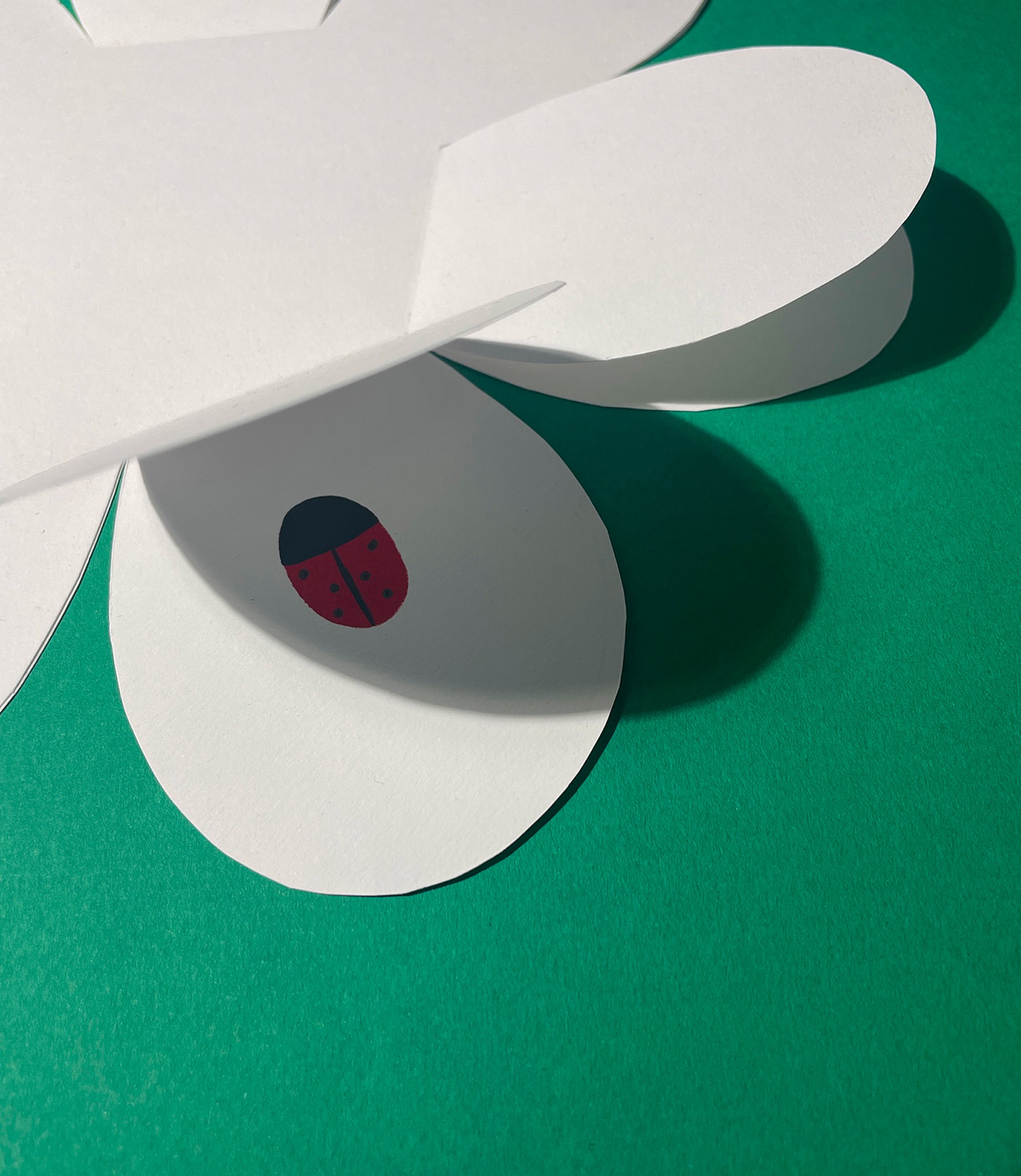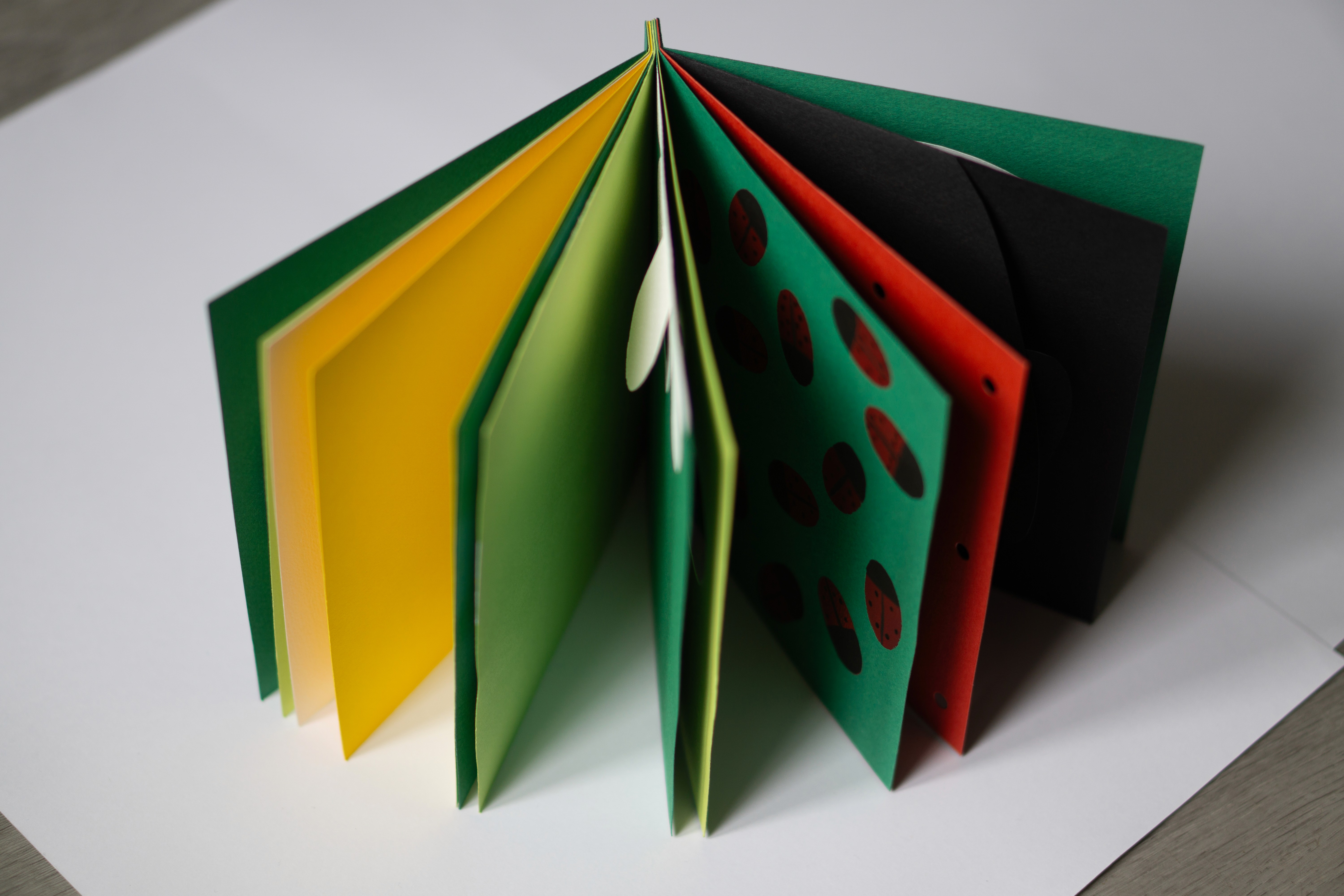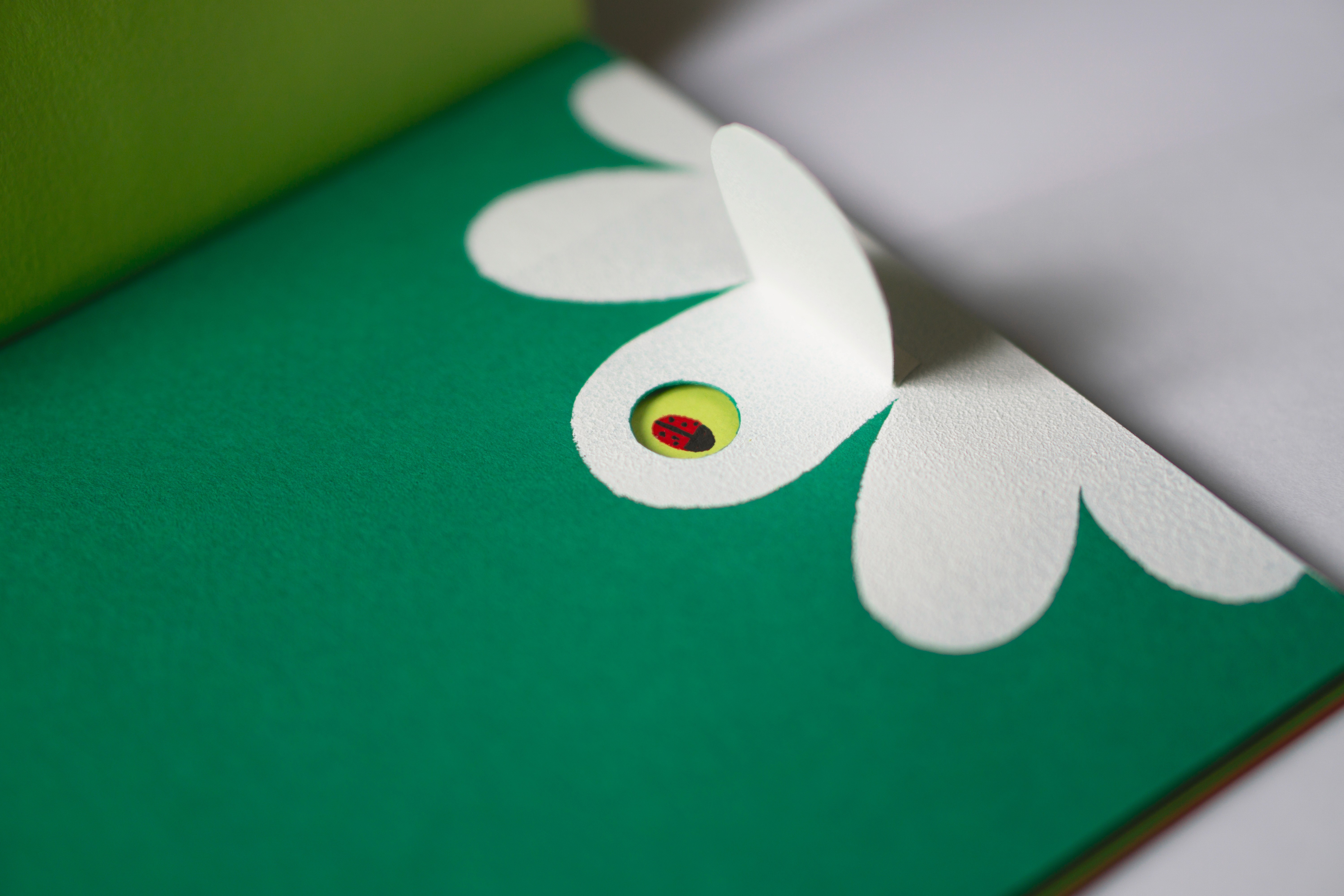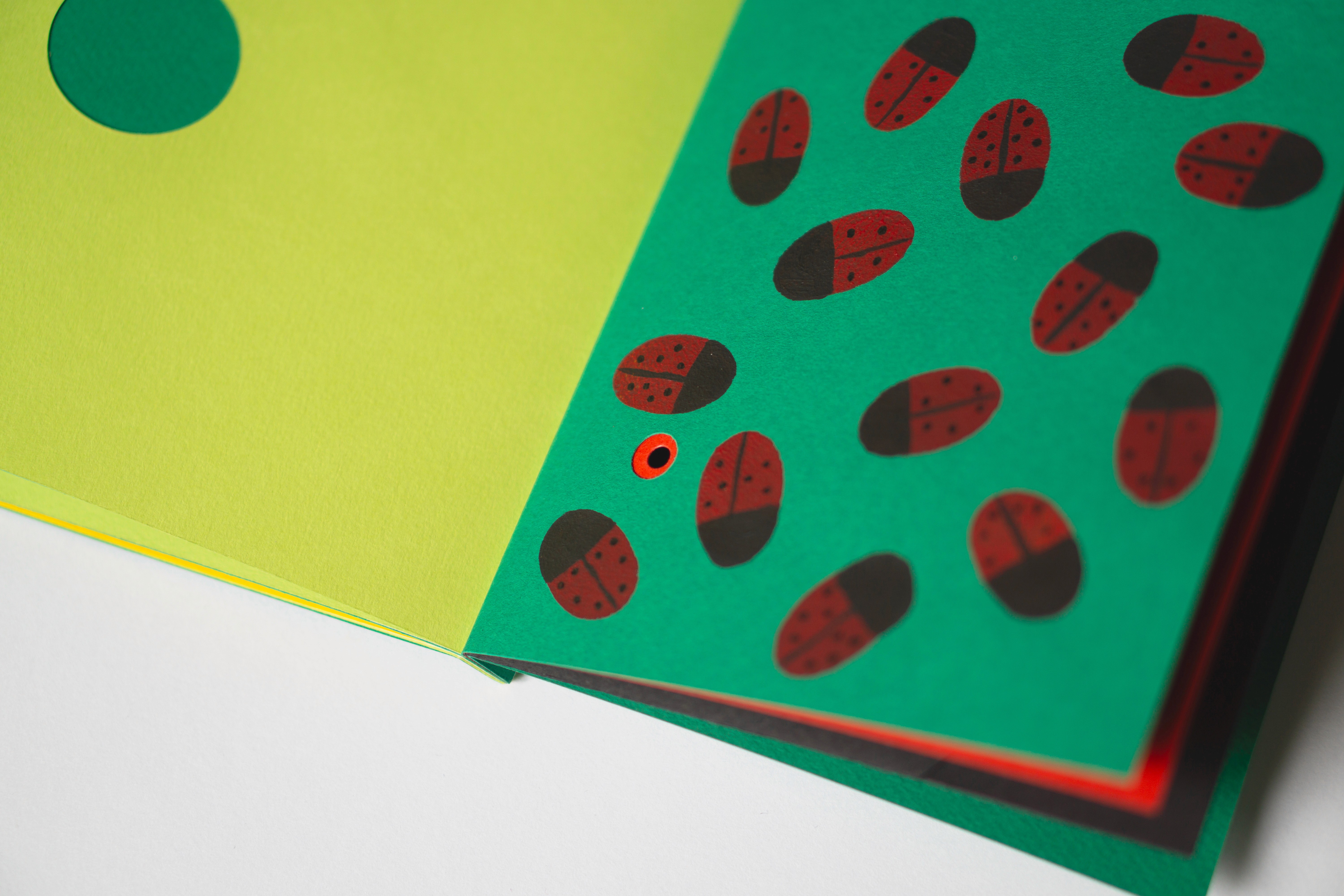 Ce livre invite l’enfant à explorer la fleur et la coccinelle sous forme de zooms immersifs, en décomposant leurs parties à différentes échelles. L'édition est réalisée entièrement à la main, sans impression. Elle combine pochoirs, pop-up et papiers découpés, créant des motifs qui éveillent la curiosité et stimulent les sens.